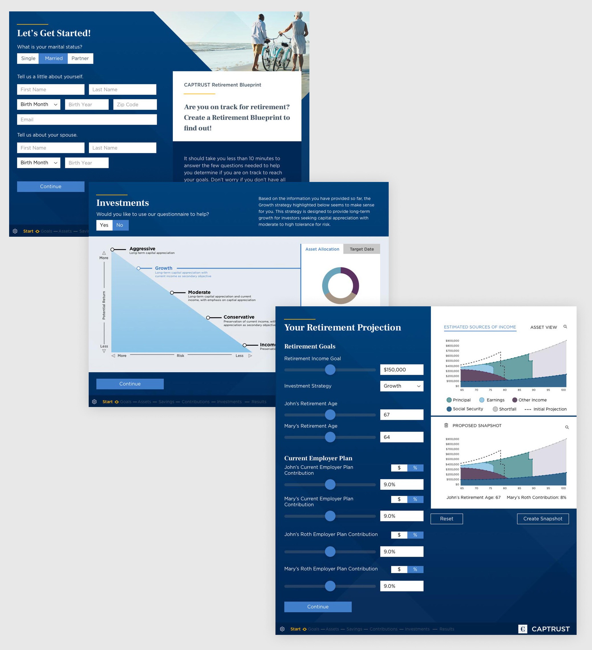 On the design side, I worked within Captrust's brand guidelines to create a UI that would blend in seamlessly with their website. Working with key stakeholders at Captrust, I created a UX flow to guide customers through various forms to gather all the data Captrust's CFP's would need.