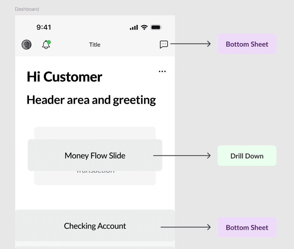 After determining a visual direction to go in, it was time to get to work on actually defining how users will interact with it with the app, and decide which features and services would be most prominent in the app. Working with a small team of stakeholders, I established core nav patterns and principals that will be used throughout and created a fully interactive prototype to test with.