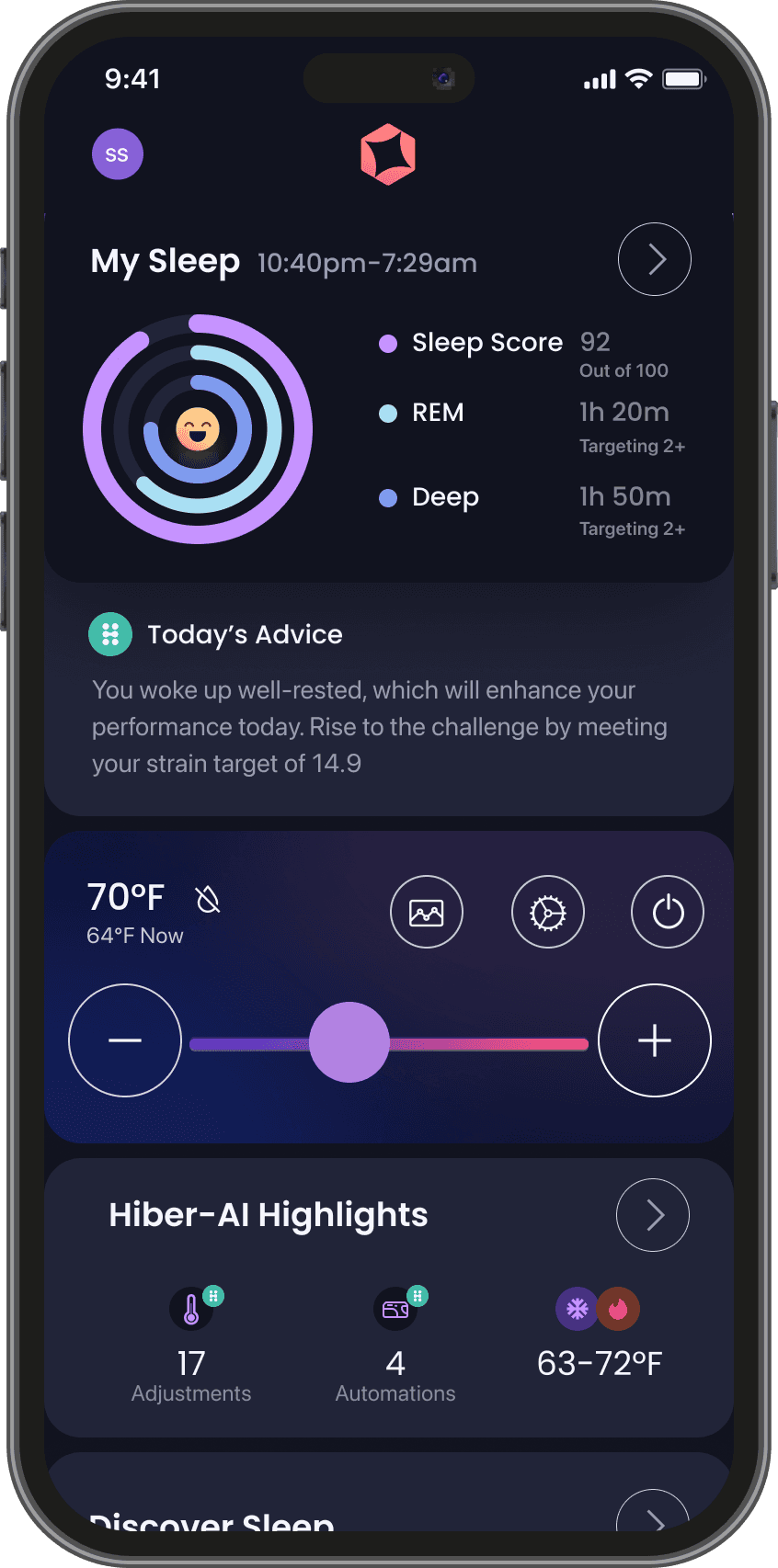 When the app was first launched its sole purpose was to function as a temperature controller for our sleep hardware (similar to a thermostat app). Since that was the only function initially, the decision was made to create a large thermostat dial that consumed most of the dashboard simply so the app wouldn't look empty while we worked behind the scenes to build out other features